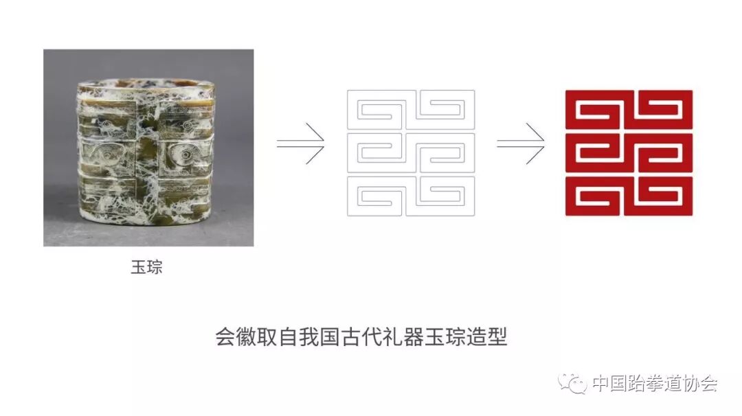 会徽取自我国古代礼器玉琮造型,君子尚玉,取其谦谦君子,温润如玉,体现跆拳道运动以礼为先的项目文化。